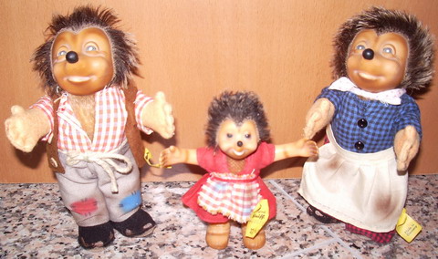Oben sehen Sie ein Bild von den Steiff-Figuren Mecki, seiner Frau